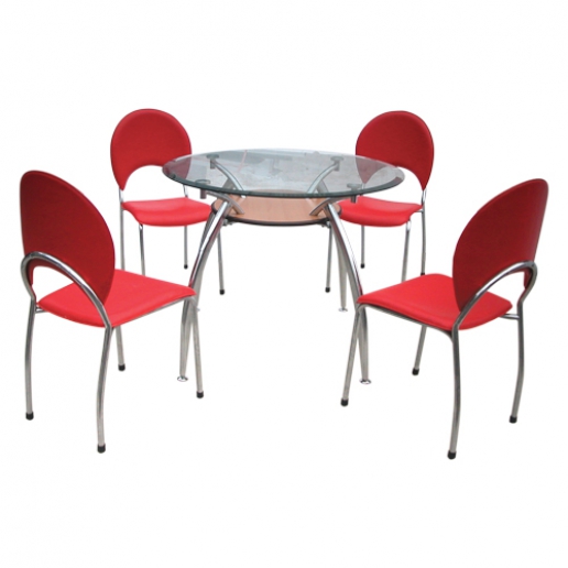 - Bàn ăn kính mặt tròn, có 4 chân khung thép mạ có ngăn bàn bằng gỗ sơn phủ PU